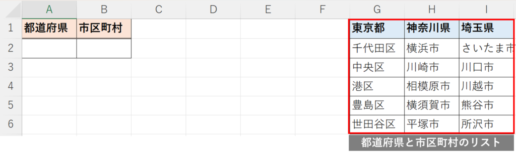 準備として、以下のように都道府県と市区町村のリストを作成します。
