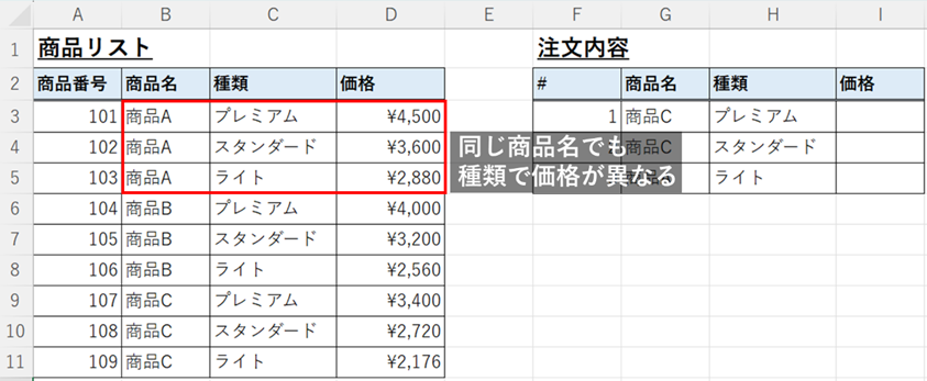 たとえば、以下のような商品リストで商品名が同じでも「プレミアム」「スタンダード」「ライト」というように種類が異なる場合があります。そのような場合、「商品Aかつプレミアム」というように複数の条件で検索する必要があります。