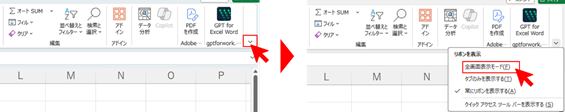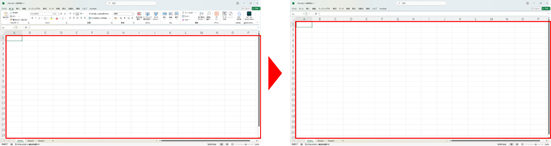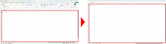 これでリボンが表示されなくなり、さらにシートの表示範囲を広げることができます。Excelを使って説明をする場合などに役に立ちます。