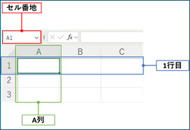 Excelでは、セルに数値、文字などのデータを入力します。この際、セルの位置は列(アルファベット)と行(数字)を組み合わせたセル番地によって表されます。たとえば、A列1行目のセル番地は「セルA1」となります。セル番地は該当のセルにカーソルを合わせると、シートの左上のボックスに表示されます。