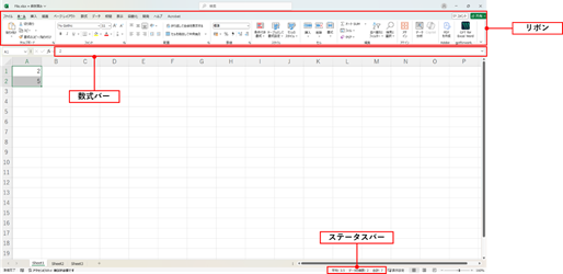 その他、Excelのワークシートには「リボン」「数式バー」「ステータスバー」があります。