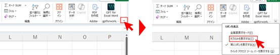 これでリボンの表示がタブのみとなり、シートの表示範囲を広げることができます。