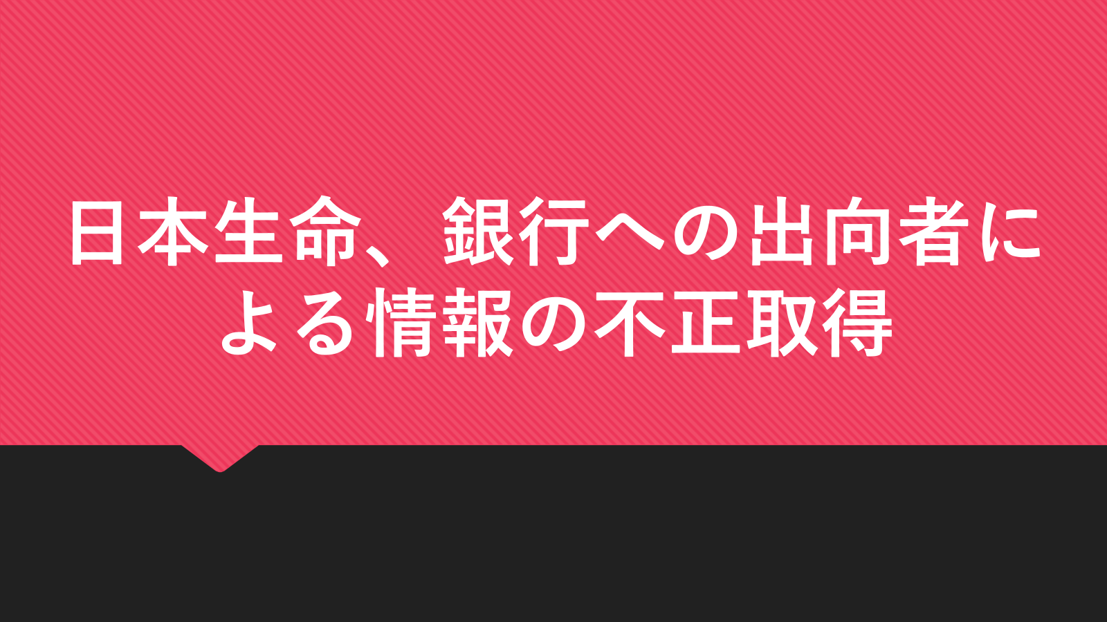 2019年5月から2025年2月にかけ、日本生命から銀行への出向者が、銀行の生命保険販売推進や業績評価体系などに関する内部情報を、上司の許可を得ずに私用スマートフォンや郵送で持ち出した。持ち出された情報は同社の銀行本部窓口担当者と共有されていた。