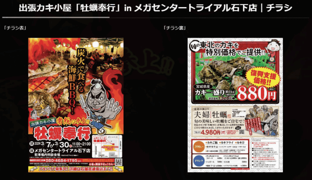 同社は、2025年2月から5月にかけて「出張カキ小屋 牡蠣奉行」という名称のウェブサイトで、「宮城県産 カキ一盛り(約1kg)」通常価格1,320円を「復興支援価格」880円で提供すると表示していた。