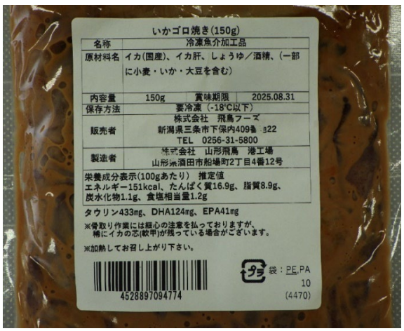 同社は、いか加工品等(商品名「いかゴロ焼き」ほか9商品について、少なくとも令和7年4月21日~7月11日に合計7,768個(2,440.59kg)を一般用加工食品等として卸売業者等延べ32社に販売した。